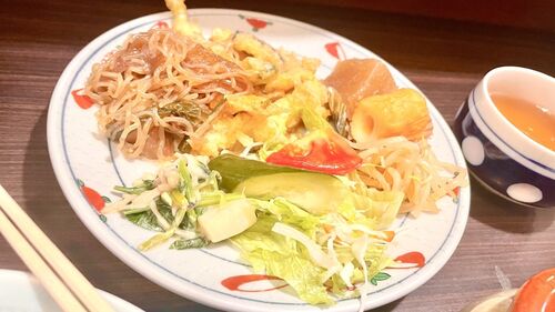 ランチについてくる、副菜の盛り合わせ? めちゃボリューミー(笑) サラダと、キュウリのぬか漬けみたいなのと、モヤシナムル、大根とちくわのおでん風煮込み、マカロニサラダ、糸こんにゃくの甘辛炒め煮みたいなの(笑) これがすごいボリュームで、 とい…