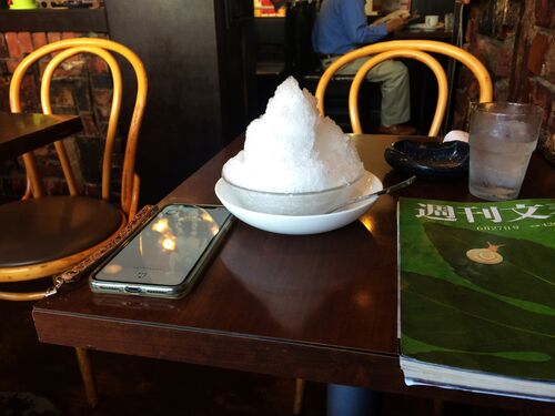 氷の暖簾に吸い寄せられてしまう (^o^; 喫茶アルバンダン。阪急電車 園田駅構内です! 常連さんが多いみたい。 リラックスして店員さんへ話しかけています。 かき氷みぞれを注文。 のんびり、ゆっくり、氷を楽しみます☆
