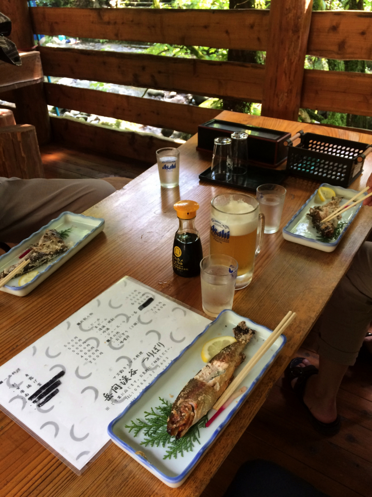 2017-09-03 ★ニジマスの塩焼き 201709-1 熊本 外飲み 台所らしき奥へ向かって「塩焼きくださぁ~い!」呼びかけたら、 「時間かかりますけどいいですかー」て、生け簀のニジマスを捕りに行ったよ(笑) テラス席、 エライ人達の暑気払いに使われててもおかしくないくらいの、 優雅なる隠れ家的風情と潤沢なマイナスイオンっぷり。