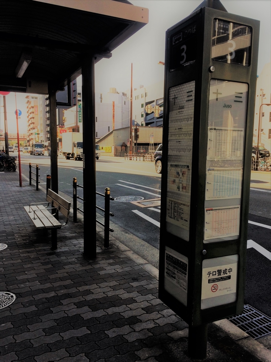 阪急電車 十三駅の改札口を出て、てくてく商店街を抜けて、大通りを渡って、ようやくバス停に着くんですよ~!