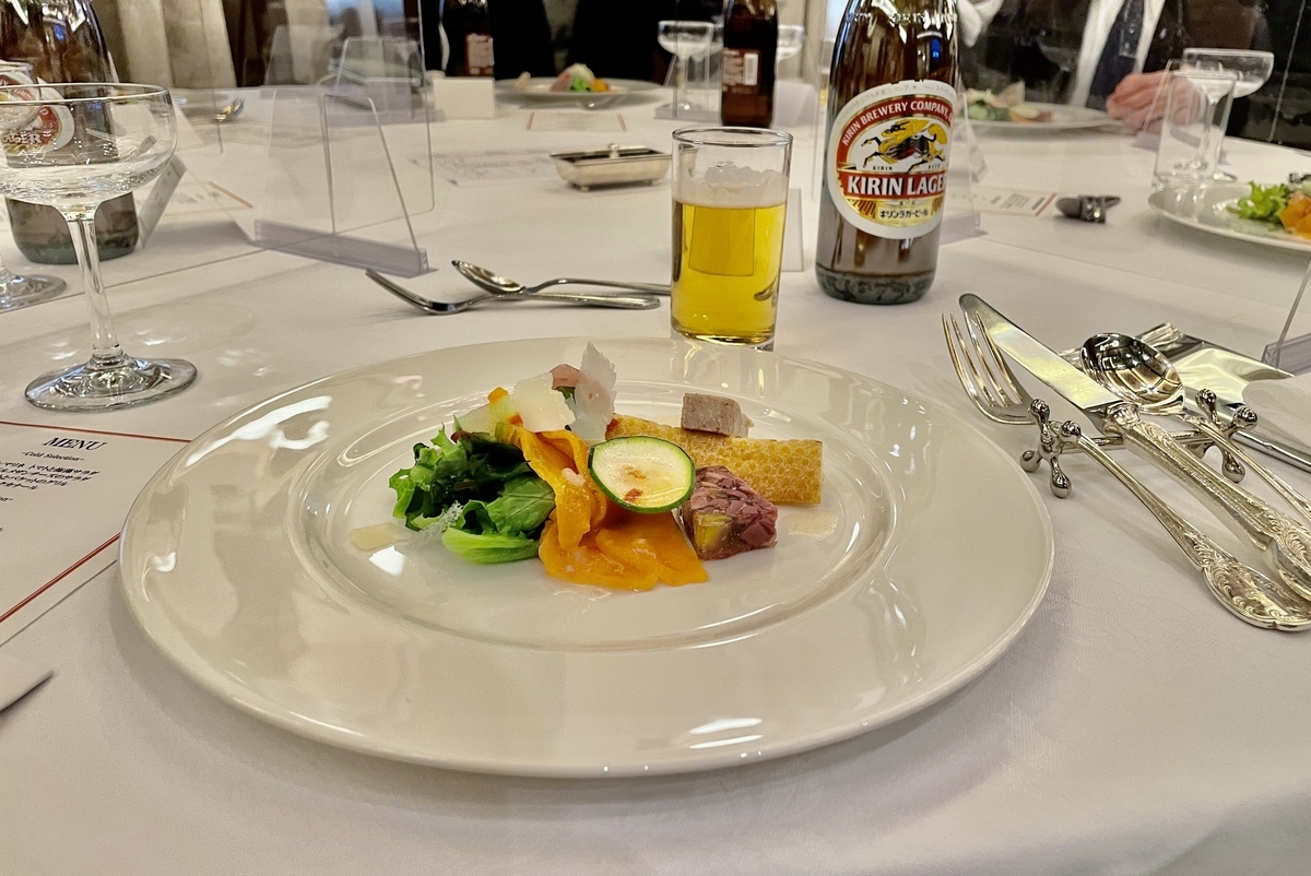 2021-04-08 ★懇親会 大阪 ホテルモントレー 外飲み 202104-2 いっぱい飲むぞー(笑) サーモンマリネ トマトと海藻サラダ 生ハムとパルメザンチーズのサラダ 鴨のリエットとバケットのグリル アスピックカナール
