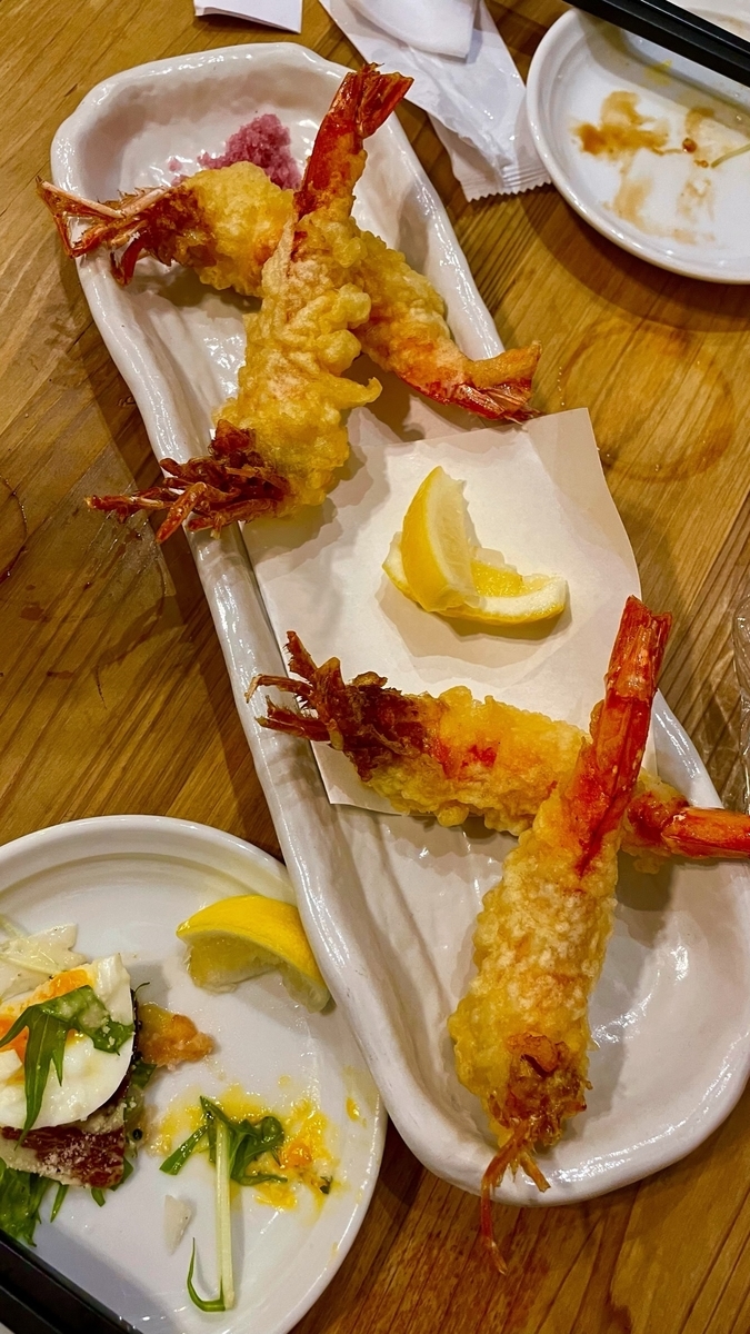 2022-11-20 ★エビ天 202211-4 大阪 外飲み TSJ これまた日本人大好きエビ天☆彡 岩塩をちょいちょいつけながら食べると、ビールのあてに最高! 私は、エビ天のしっぽ食べる派です(笑) カリっとなっててほしいけど(笑)